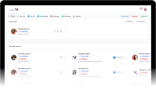 WorkGPT AI Bot của Innocom hỗ trợ tự động trên Zalo, Messenger, Web, Whatsapp với quản lý tập trung trên một giao diện duy nhất.