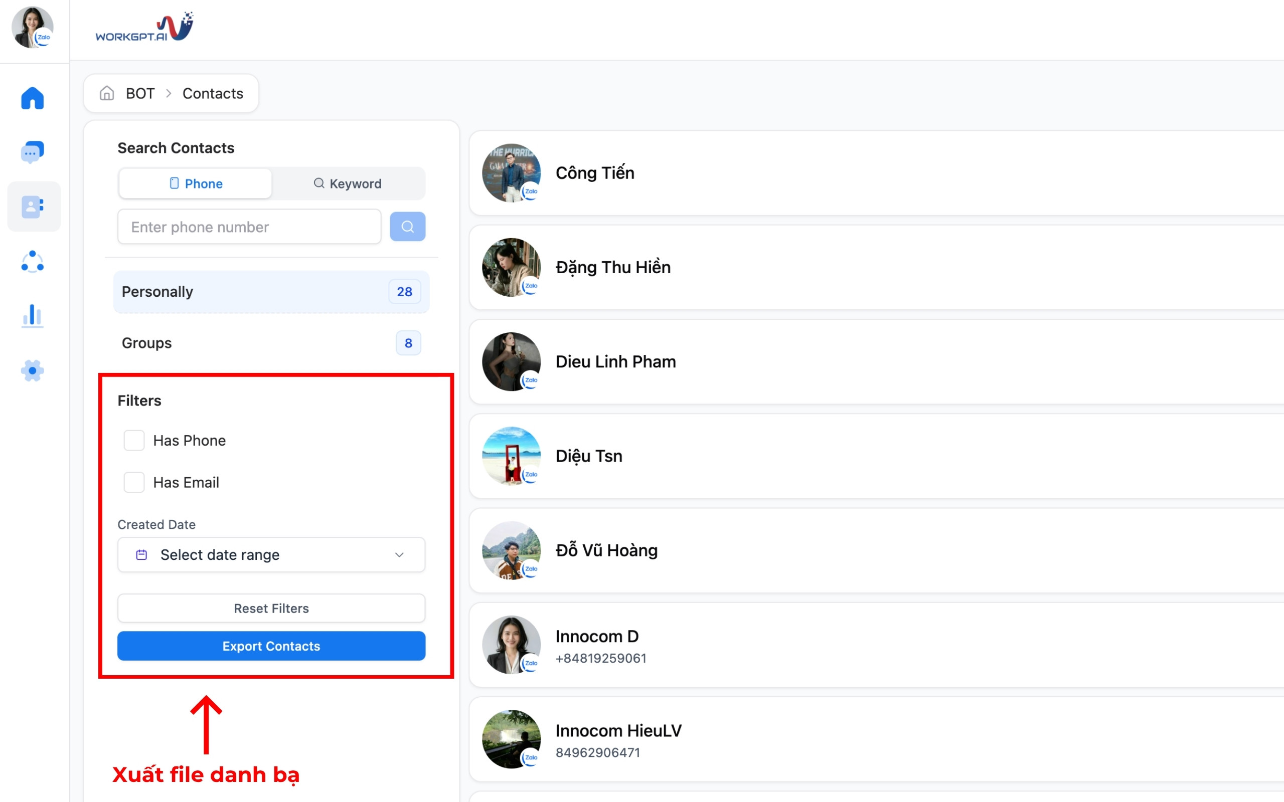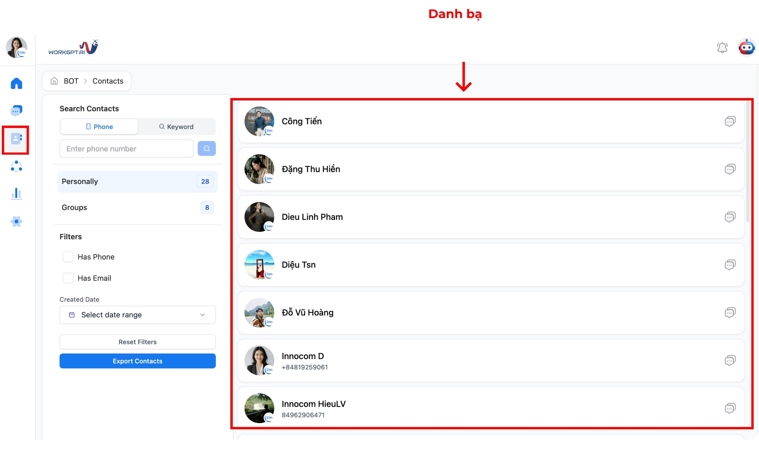 Các liên hệ mới sẽ được lưu vào danh bạ của WorkGPT ZaloTeam.
