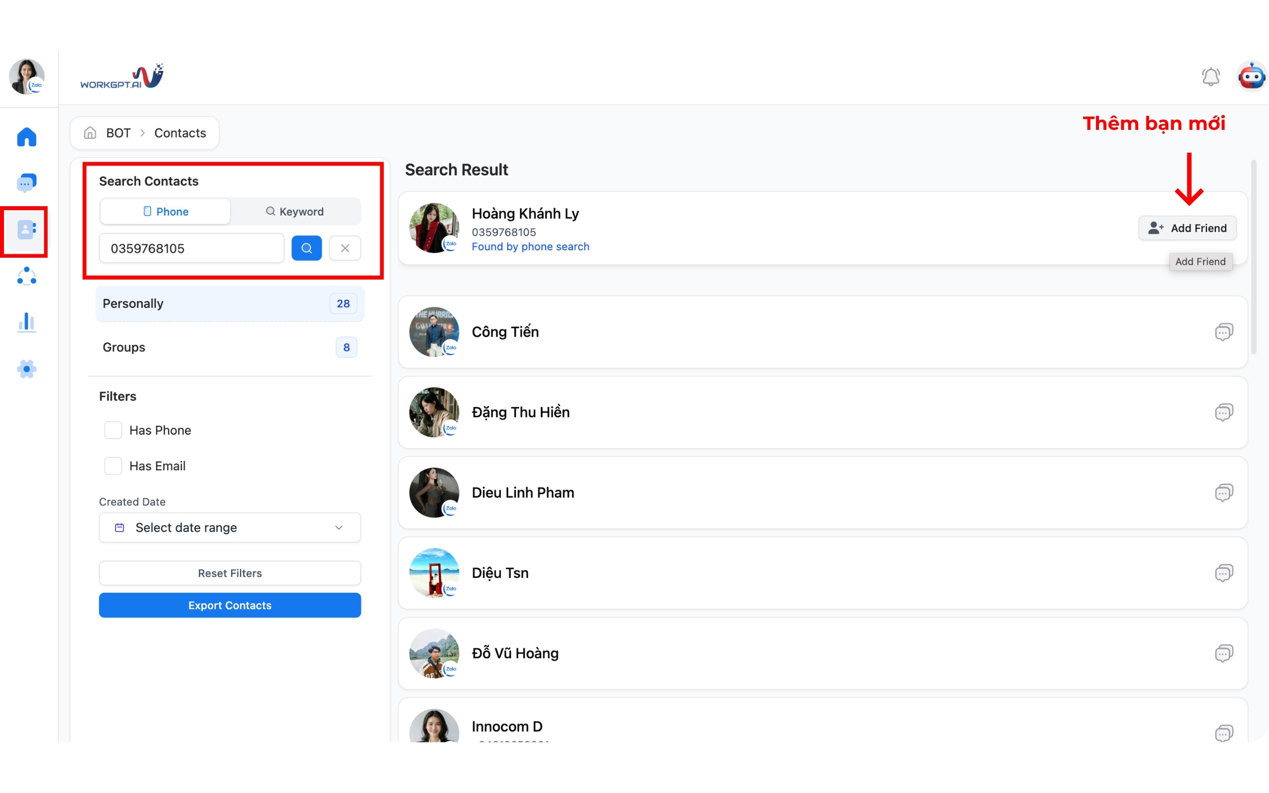 Bước 2: Bạn có thể tìm kiếm và kết bạn với liên hệ mới bằng số điện thoại ngay trên phần mềm WorkGPT ZaloTeam.