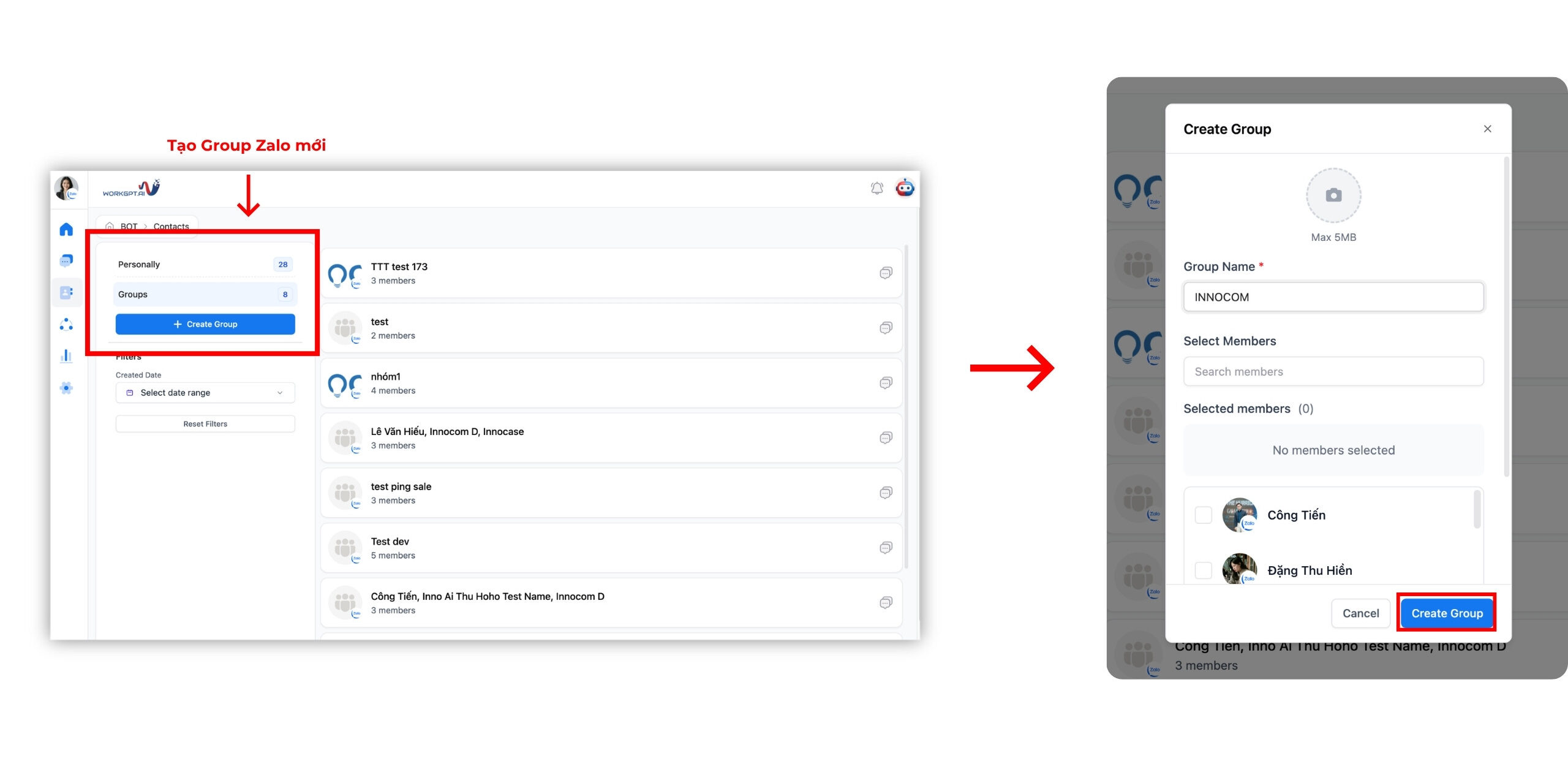 Bước 4: WorkGPT ZaloTeam cũng cho phép bạn tạo Group một cách nhanh chóng bằng cách: