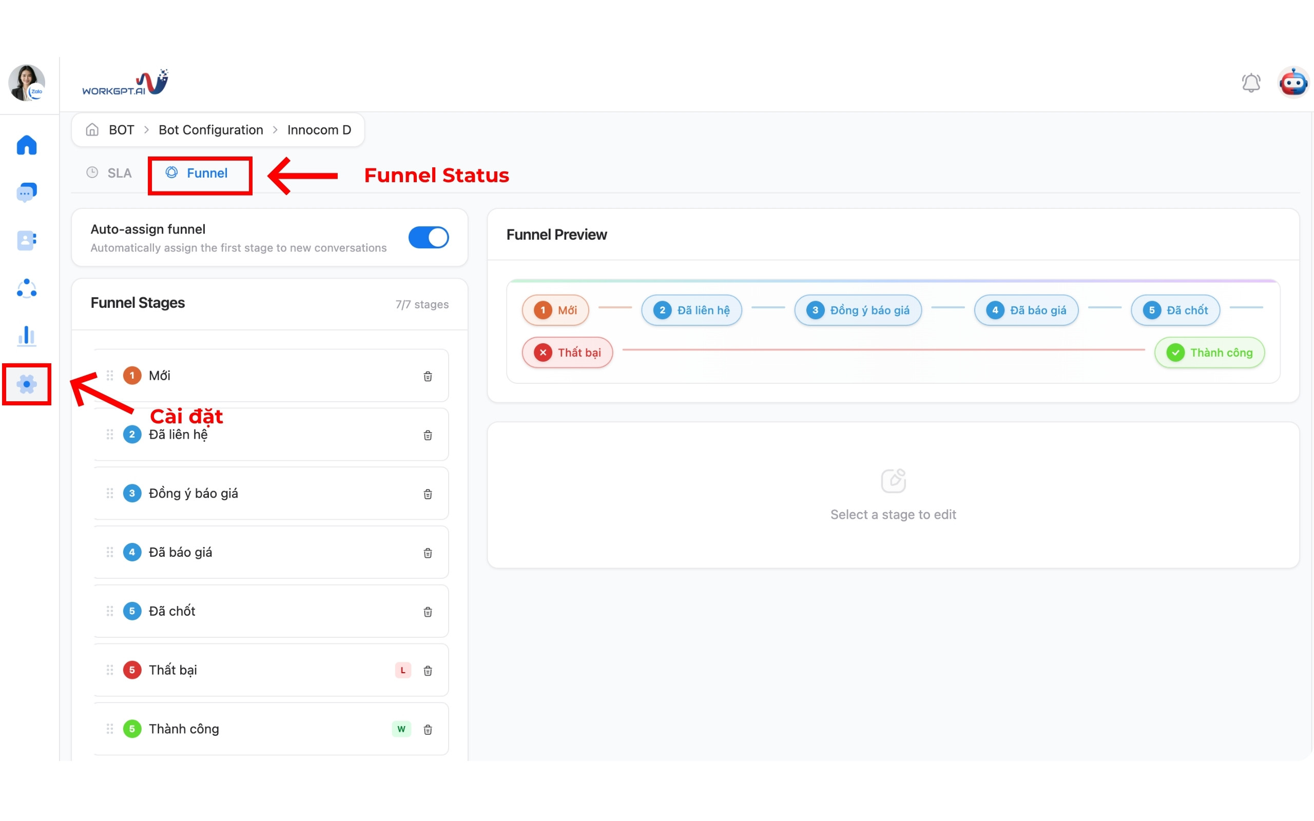 Bước 1: Để tiến hành cài đặt cấu hình Phễu bán hàng (Funnel Status) tại thanh menu bên trái bạn nhấp vào biểu tượng Cài đặt → Chọn tab Funnel