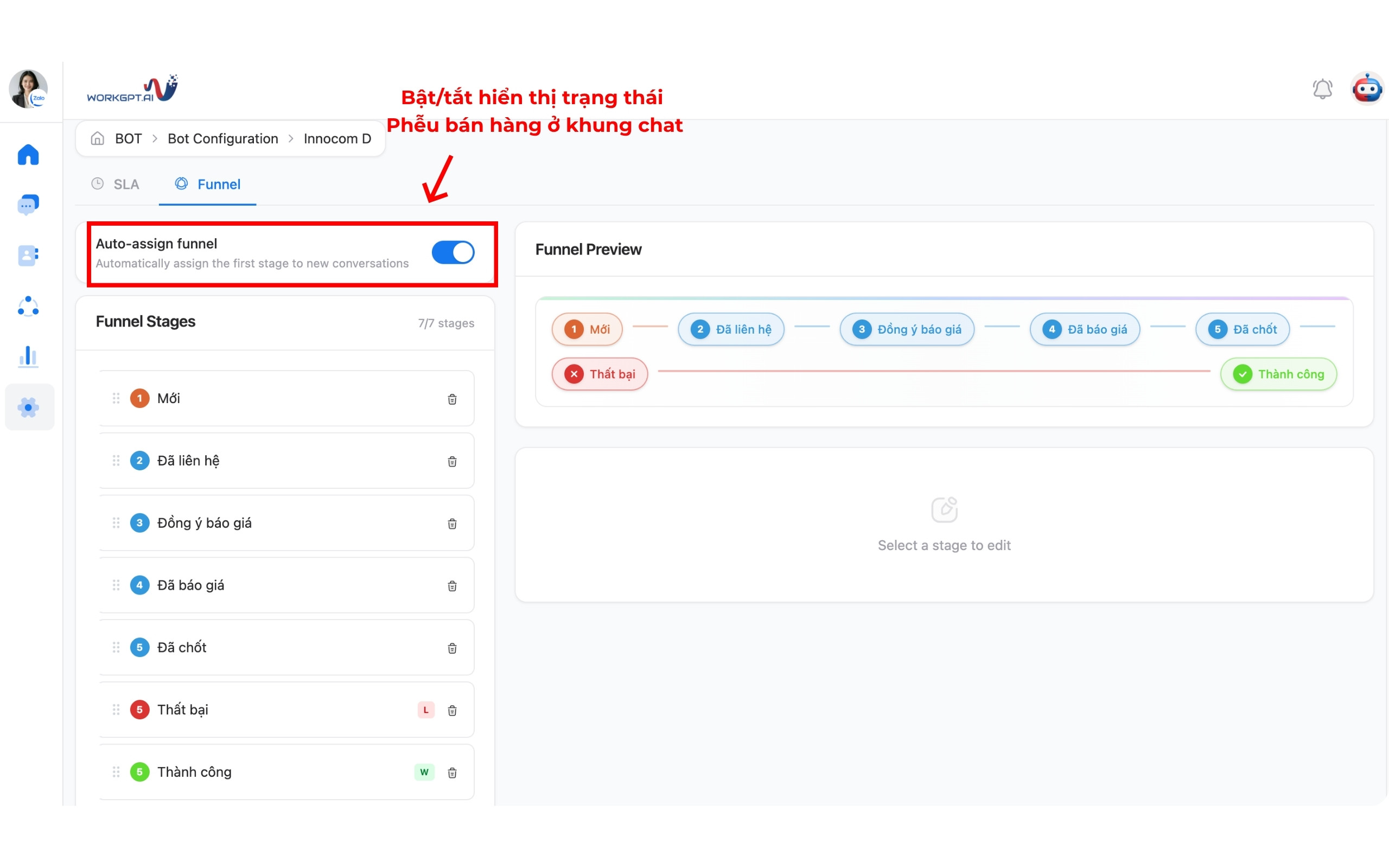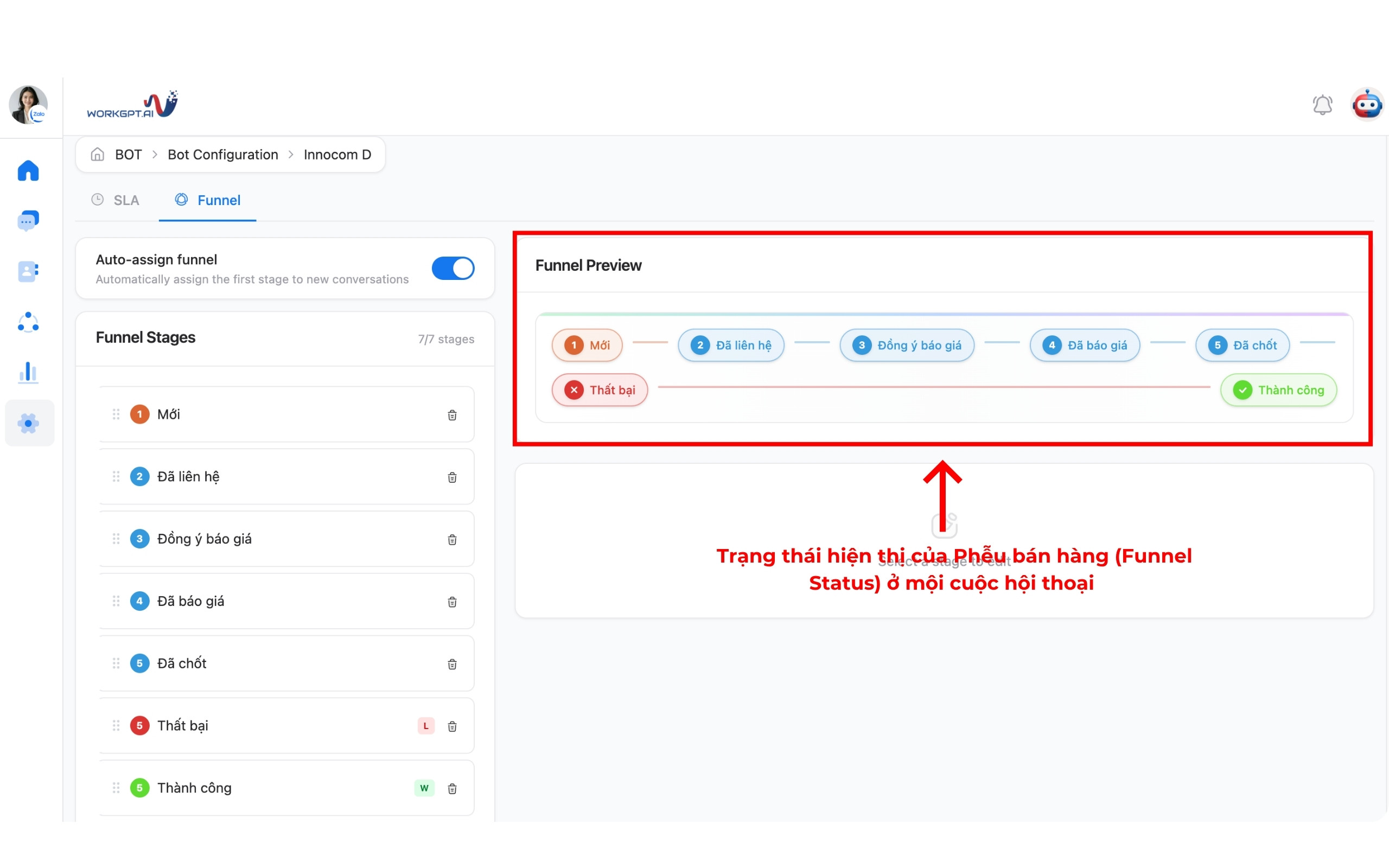 Bước 2: Bạn có thể Tắt/Bật trạng thái hiển thị Funnel Status tại mỗi cuộc hội thoại tại nút “Auto-assign funnel”