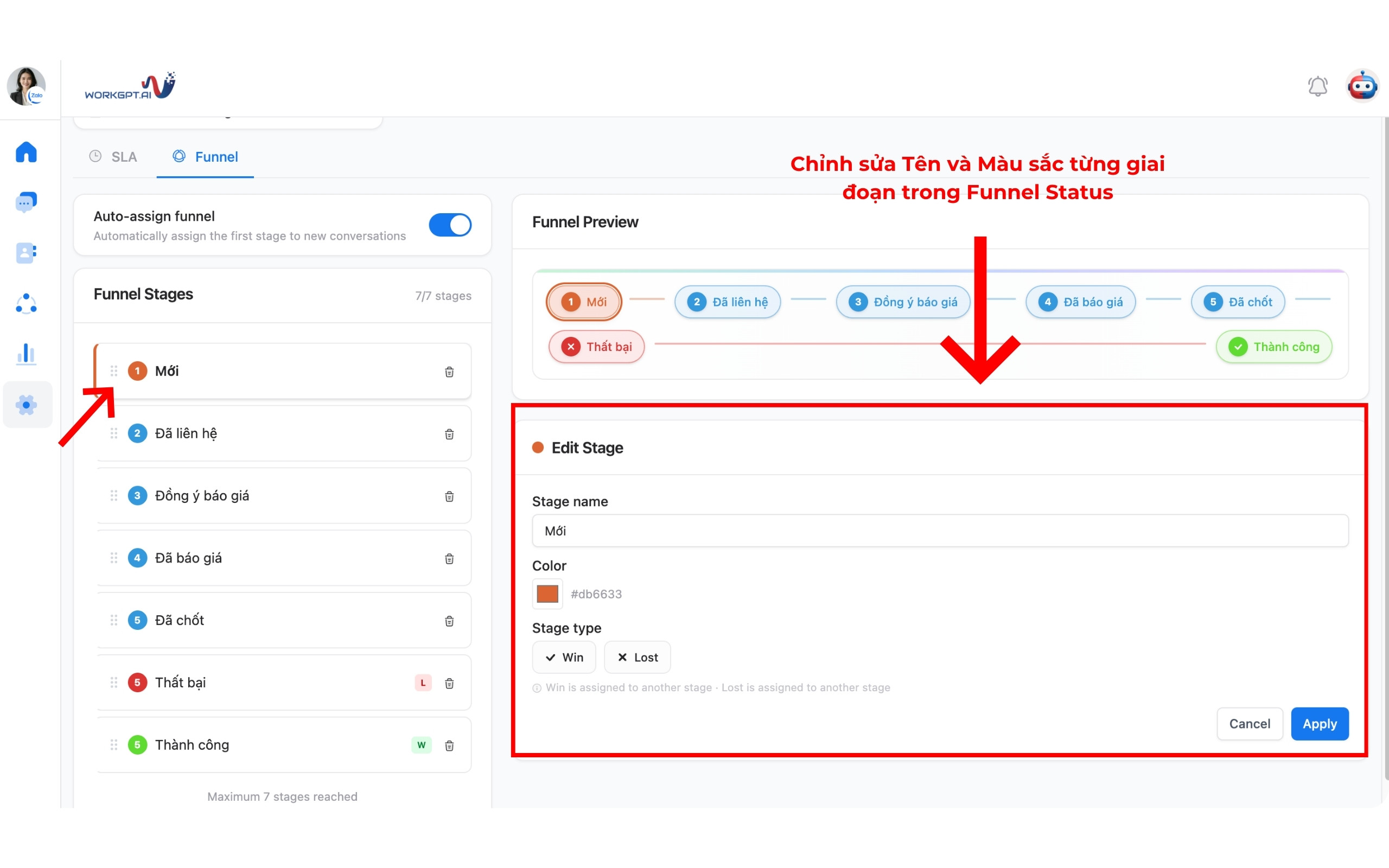 Để chỉnh sửa từng giai đoạn trong Phễu, bạn chọn 1 tab ở Funnel Stages → Chỉnh sửa Tên và Màu sắc tại hộp thoại Edit Stage → Ấn nút Apply để hoàn thành