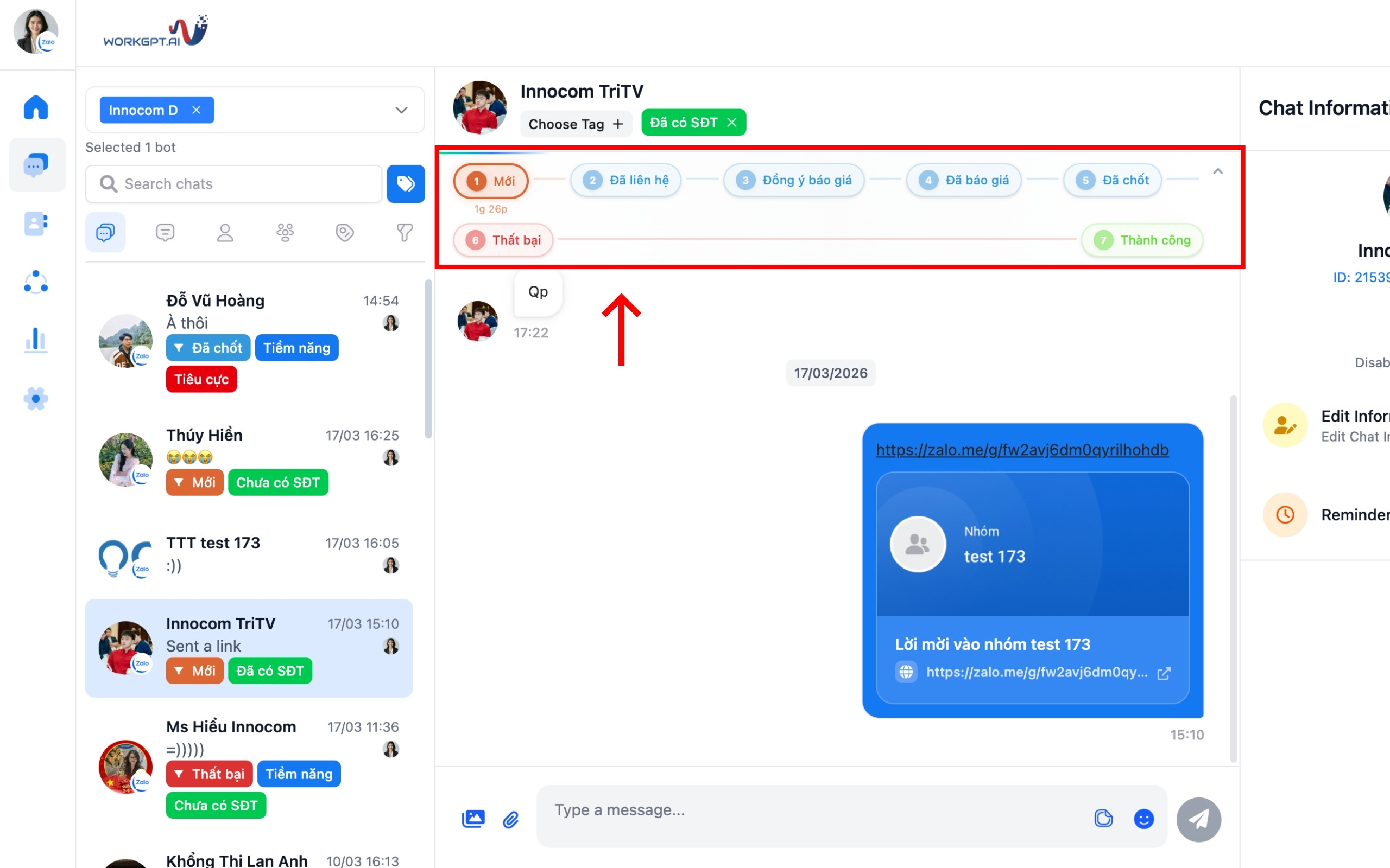 - Thanh Funnel Status sẽ nằm cố định ở ngay phía trên cùng của khung chat, hiển thị toàn bộ hành trình của khách hàng hiện tại.