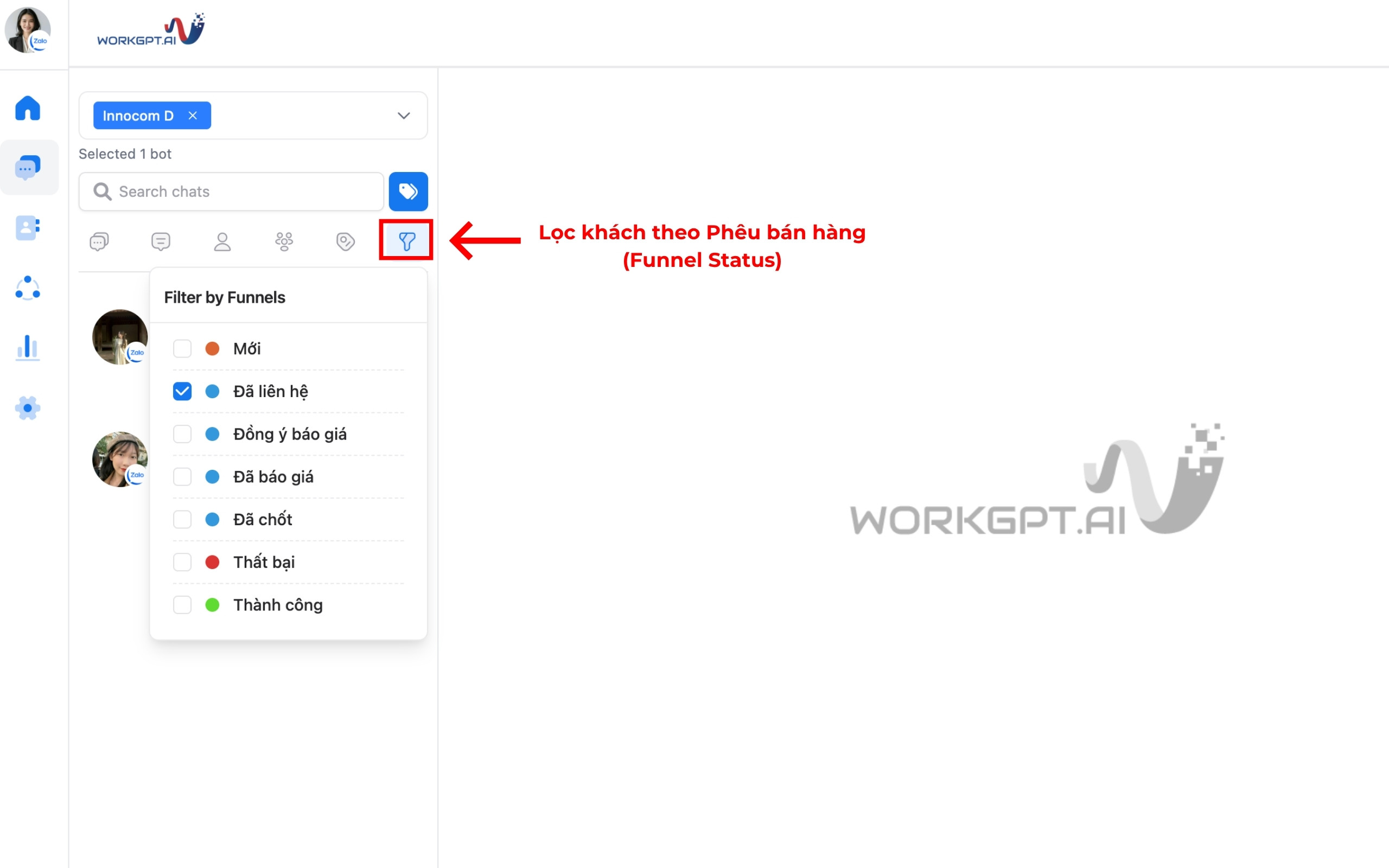 Bước 6: Tại màn hình Quản lý chat, bạn có thể sử dụng bộ lọc để lọc tệp khách theo từng giai đoạn trong Phễu bán hàng (Funnel Status) để tiện chăm sóc