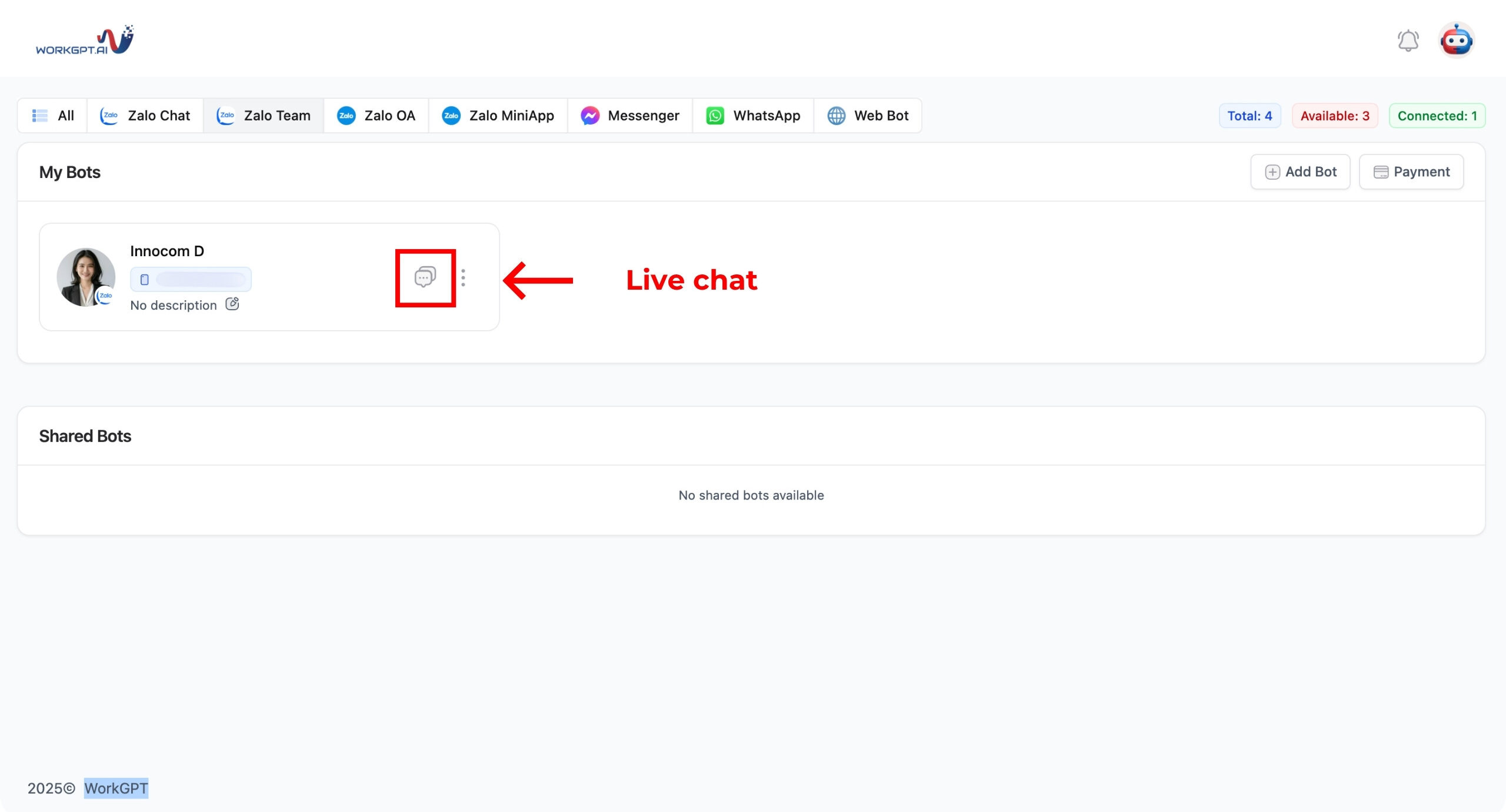 Bước 1: Tại màn hình chính, bạn ấn vào nút “+ Add Bot” để bắt đầu kết nối.