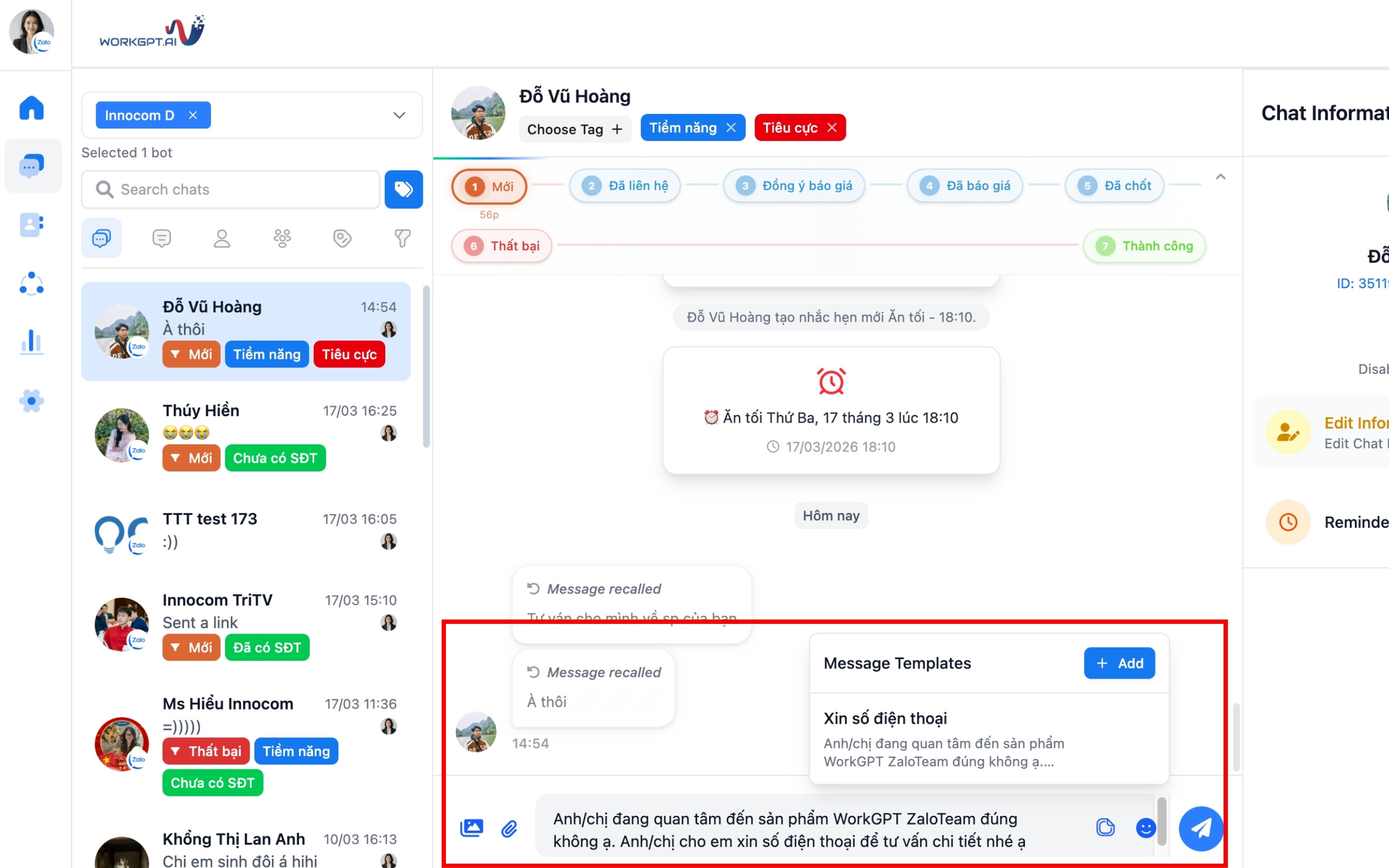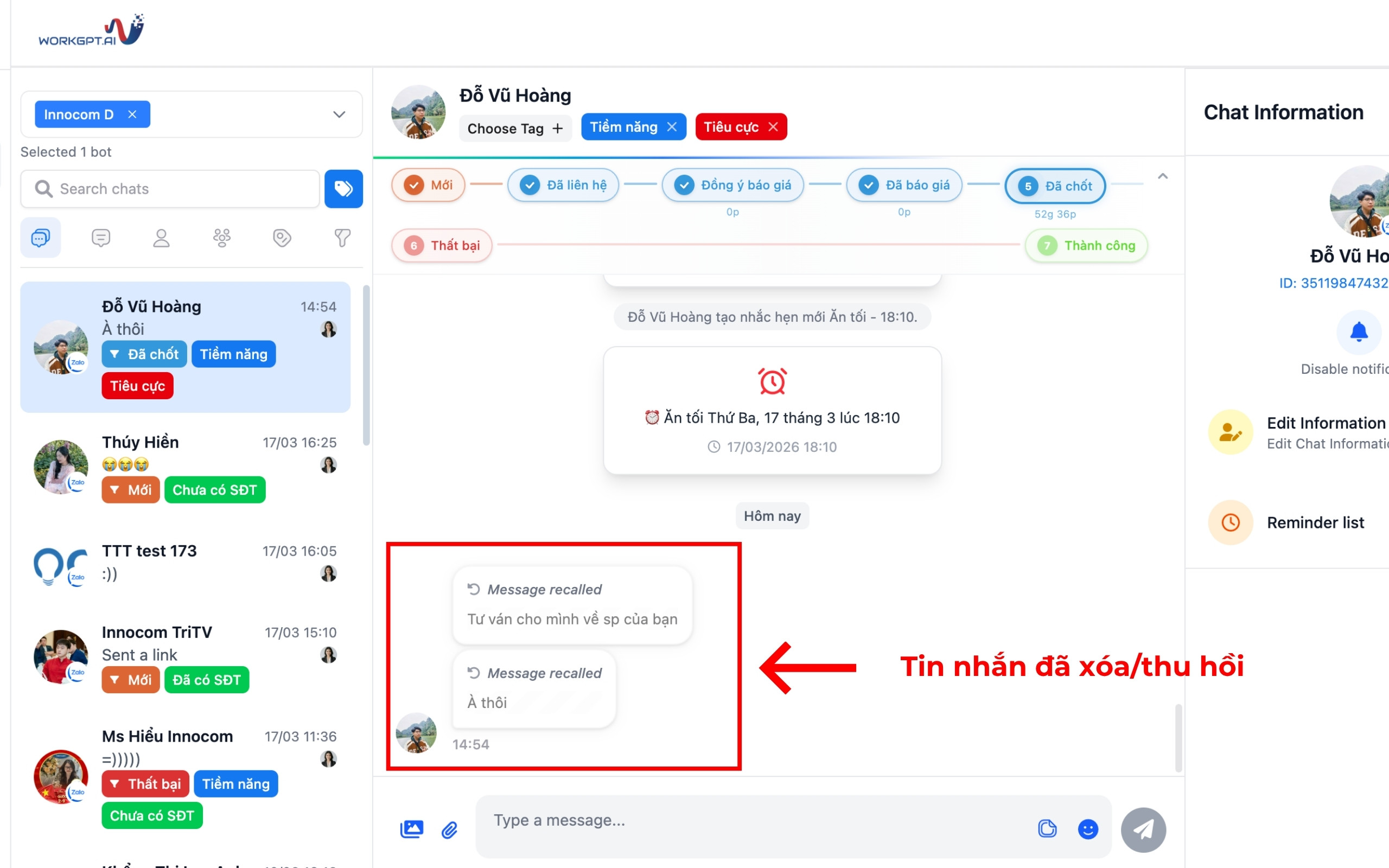 Bước 2: Tại màn hình quản lý tin nhắn bạn có thể xem được toàn bộ cuộc hội thoại của nhân viên với khách hàng. Toàn bộ tin nhắn đã xóa/thu hồi vẫn hiển thị trực tiếp trên luồng chat WorkGPT ZaloTeam. Nội dung gốc được giữ lại mờ ngay dưới dòng Message recalled: