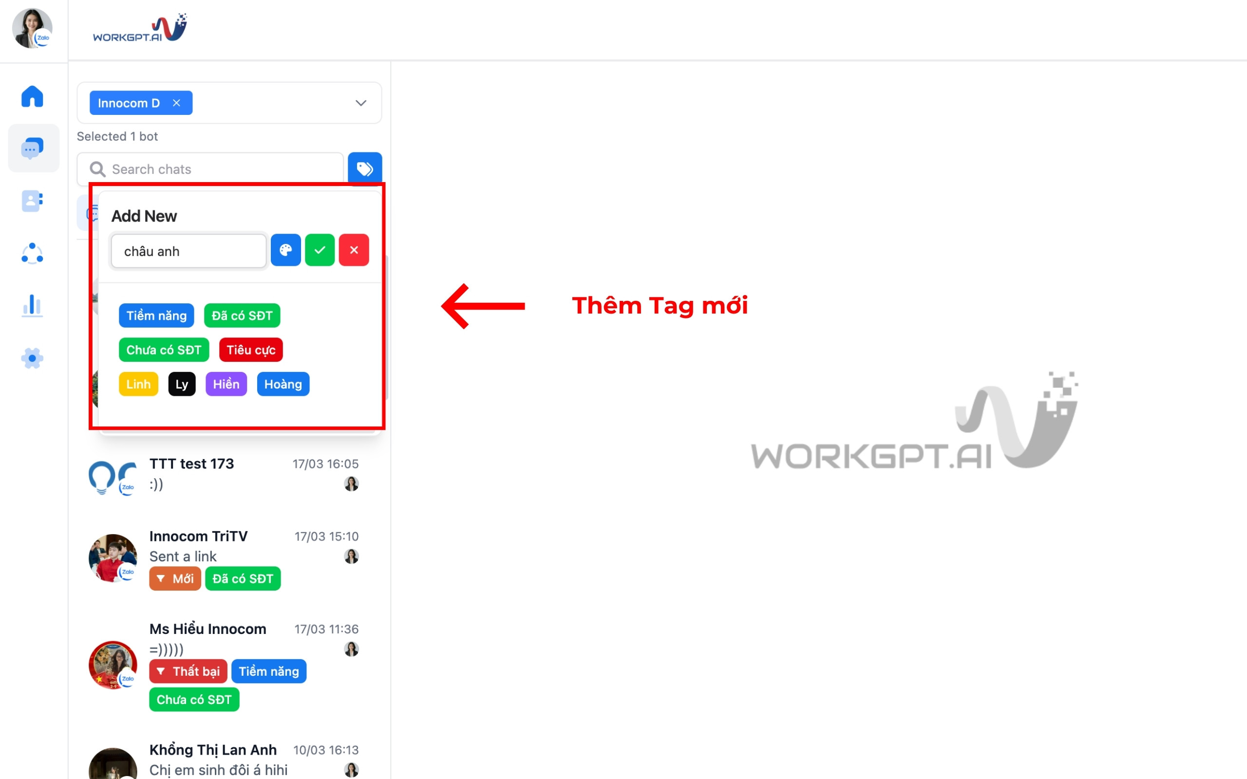 Bước 1: Đầu tiên bạn vào mục “Add New”. Để tạo tag mới, bạn cần nhập tên tag và chọn màu, sau đó bấm dấu tích xanh để tạo. Bạn cũng có thể sửa hoặc xóa tag khi cần. Sau khi tạo thành công, tag mới sẽ được hiển thị tại “Danh sách tag” ngay ở bên dưới:
