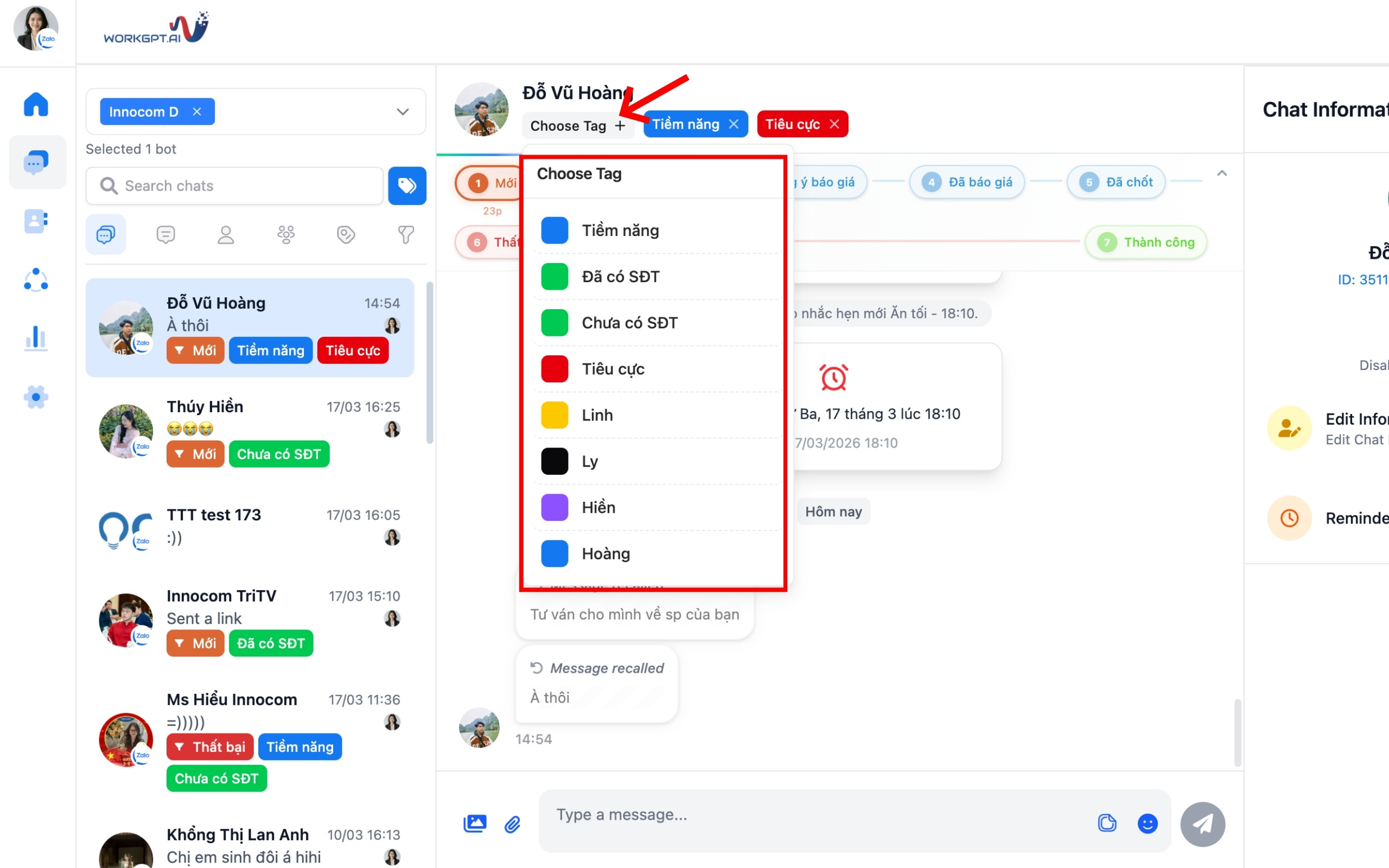 Bước 2: Để gắn tag phân loại cho khách hàng, bạn bấm chọn hội thoại → Chọn “Choose Tag” → Chọn tag cần gắn.