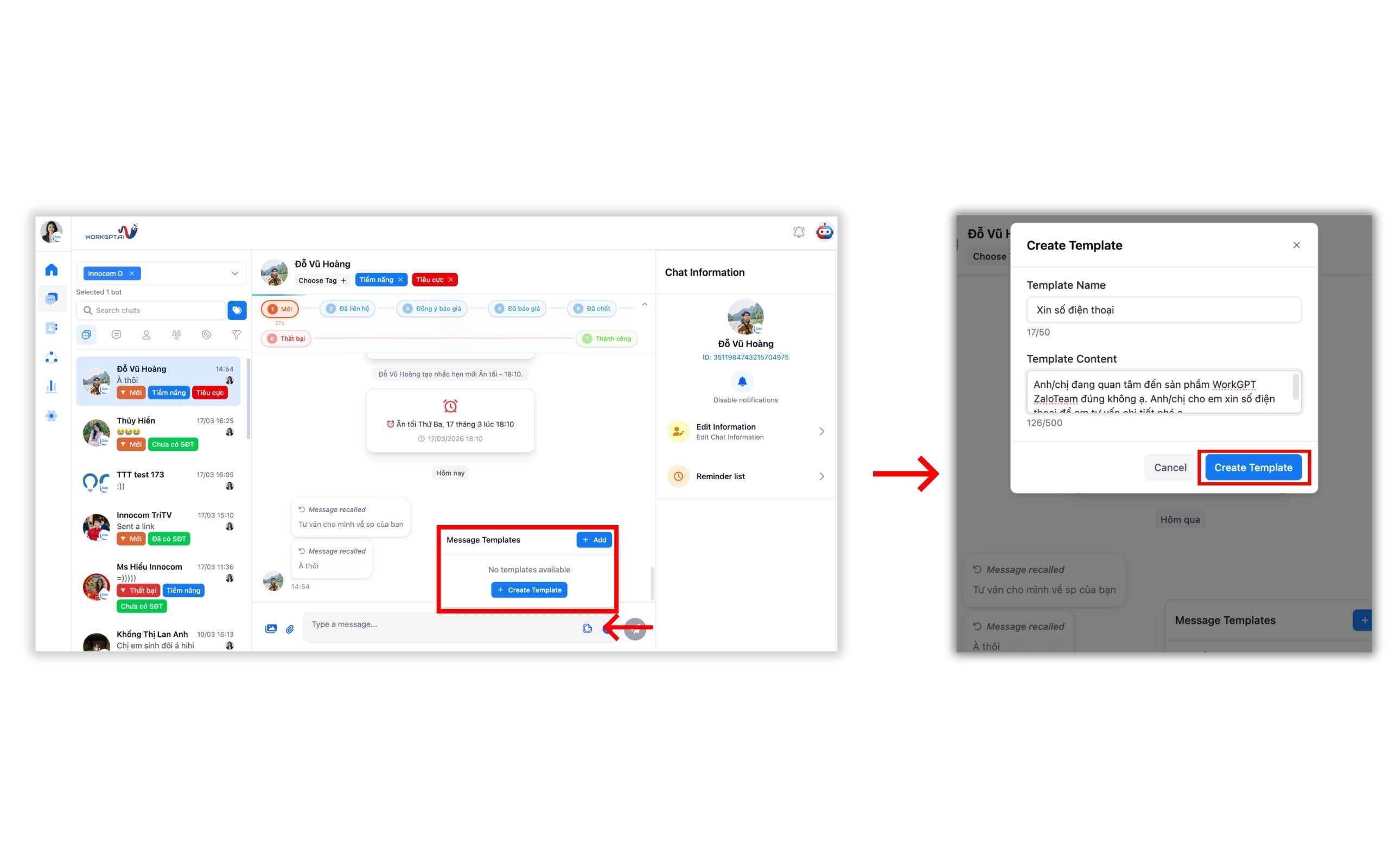 Bước 1: Click vào biểu tượng văn bản (Message Templates) ở khu vực soạn thảo tin nhắn → Chọn Create Template để tạo tin nhắn mẫu mới → Pop up Create Template hiện ra → Nhập tiêu đề (Template name) và nội dung tin nhắn mẫu (Template Content) → Chọn Create Template để hoàn tất