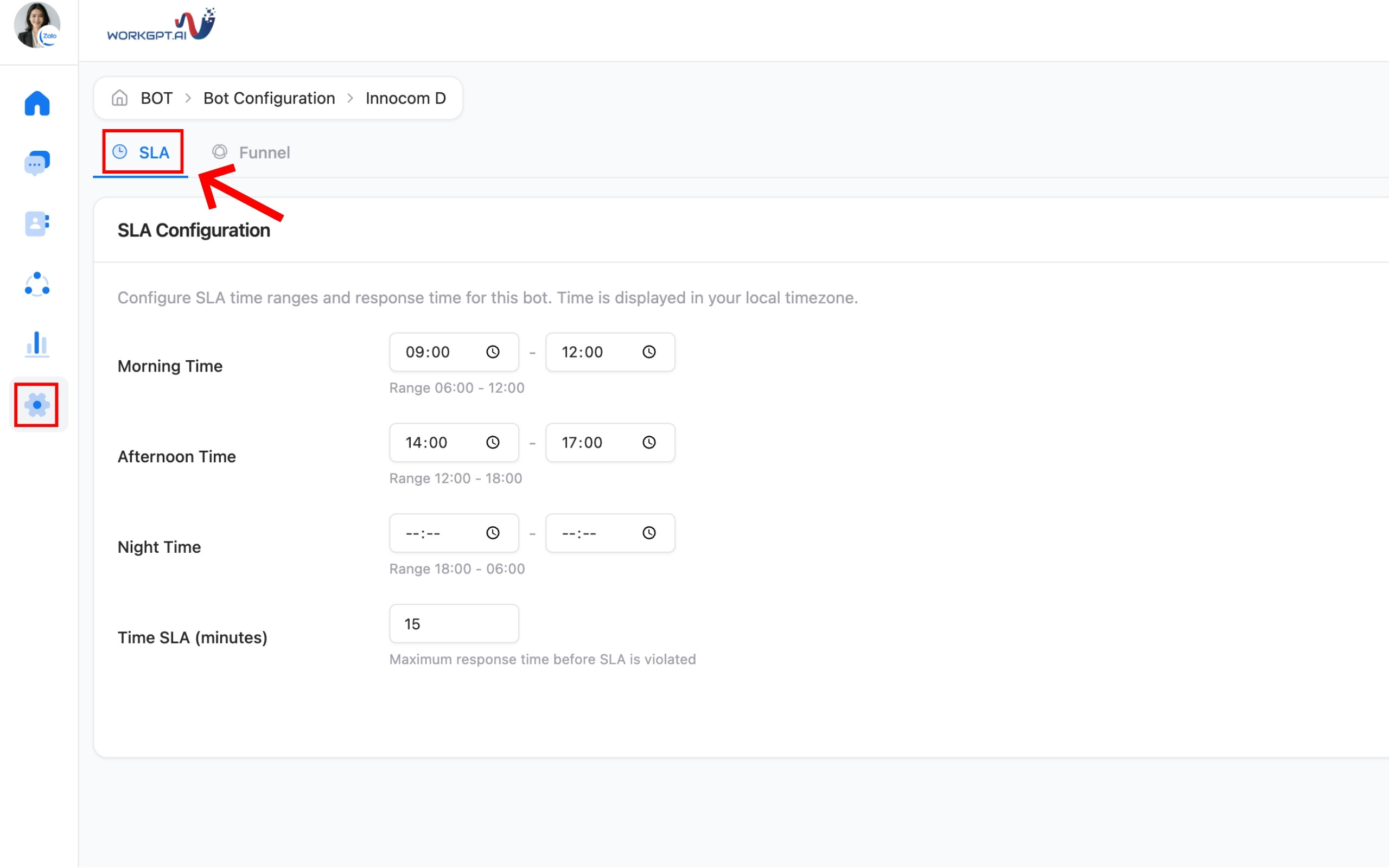 - Đặt thời gian giới hạn: Nhập số phút yêu cầu vào ô Time SLA (minutes). (Ví dụ: Nhập 15 để yêu cầu nhân viên phải trả lời trong vòng 15 phút từ lúc khách nhắn).