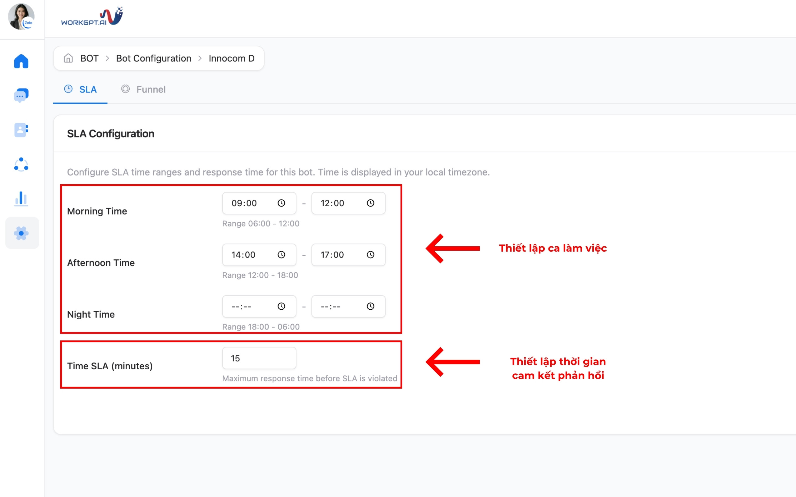 - Cài đặt ca làm việc: Thiết lập khung giờ trực chat tại các mục Morning Time (Sáng), Afternoon Time (Chiều), Night Time (Tối). (Tin nhắn đến ngoài các khung giờ này sẽ không bị tính vi phạm).
