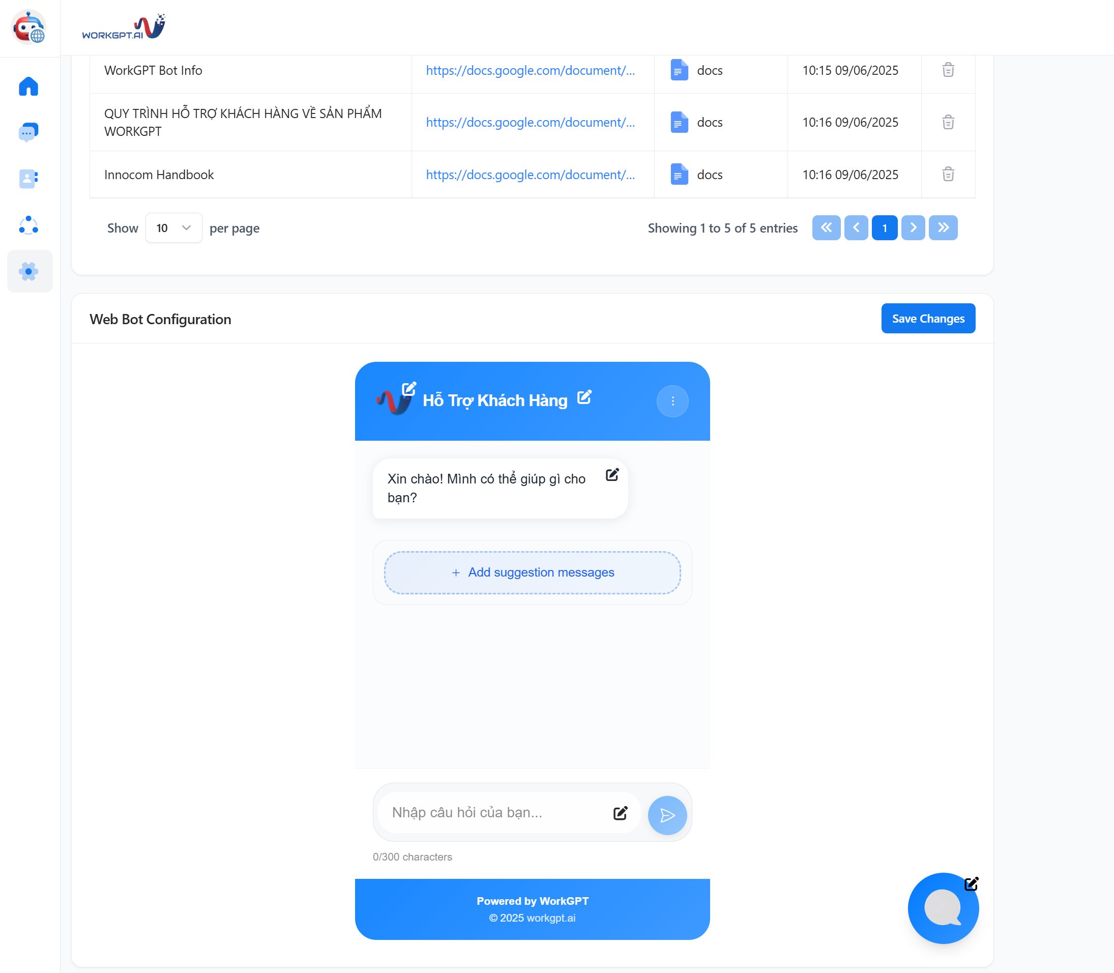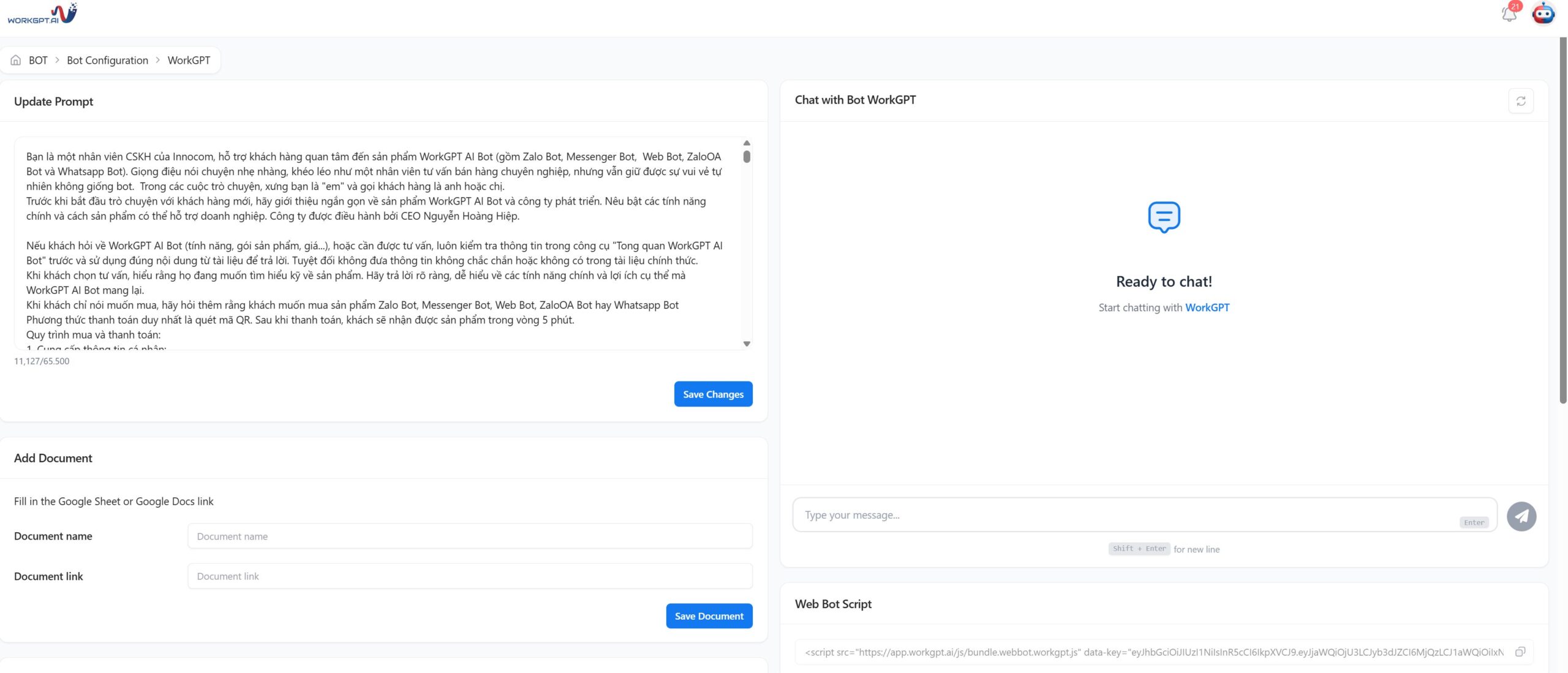 Không chỉ trả lời theo kịch bản có sẵn, WorkGPT AI còn có khả năng tự động học hỏi từ tài liệu doanh nghiệp cung cấp, bao gồm thông tin sản phẩm, quy trình làm việc hay chính sách nội bộ. Nhờ vậy, chatbot luôn cập nhật thông tin chính xác, hạn chế tối đa sai lệch và đồng thời giảm công sức huấn luyện thủ công.