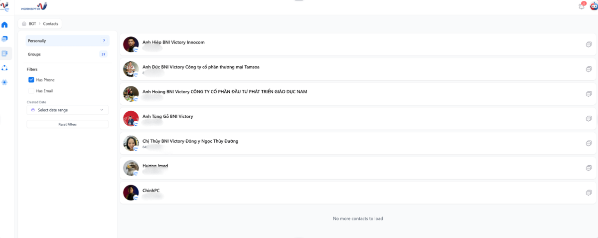 WorkGPT Chatbot AI hỗ trợ lọc và xuất danh sách khách hàng một cách linh hoạt, giúp doanh nghiệp dễ dàng quản lý và khai thác dữ liệu. Bạn có thể lọc khách hàng theo thời gian, trạng thái hội thoại hoặc các tiêu chí cụ thể, rồi xuất dữ liệu nhanh chóng để phục vụ cho việc chăm sóc, tiếp thị lại hoặc phân tích hiệu quả kinh doanh.