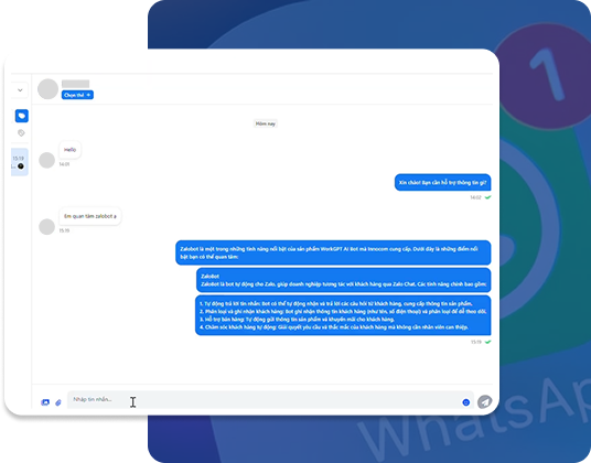 WorkGPT WhatsAppBot là trợ lý ảo giúp doanh nghiệp giao tiếp với khách hàng mọi lúc, mọi nơi trên nền tảng WhatsApp. Giải pháp này hỗ trợ tư vấn, bán hàng và chăm sóc khách hàng tự động, nhanh chóng, giúp nâng cao trải nghiệm và tối ưu hiệu quả kinh doanh.