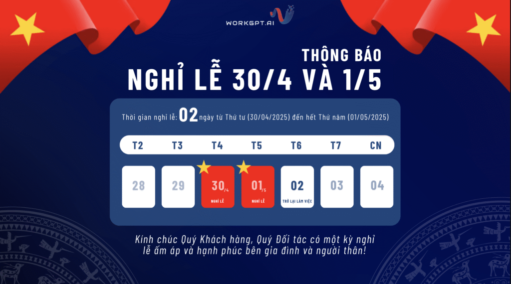 Nhân dịp kỳ nghỉ lễ Giải phóng Miền Nam (30/4) và Quốc tế Lao động (1/5), WorkGPT.ai xin trân trọng thông báo đến Quý Khách hàng và Quý Đối tác lịch nghỉ lễ như sau:
